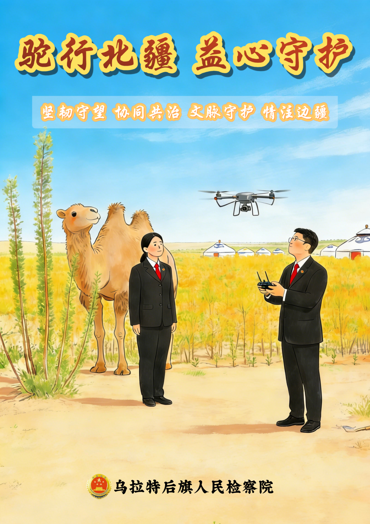 乌拉特后旗,被誉为“中国戈壁红驼之乡”。千百年来,红驼穿越沙海、负重致远,不惧酷暑严寒,不避风沙险途,以沉默而坚定的脚步,在荒原上踏出生命的轨迹。它们是北疆的守望者,是坚韧与忠诚的化身。这种精神,早已融入这片土地的血脉,也悄然启迪着我们的检察实践。