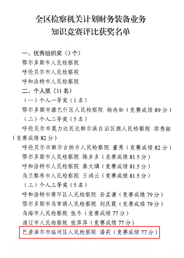 近日,在自治区检察院举办的首次全区检察机关计划财务装备业务知识竞赛中,我市临河区检察院财务人员潘莉凭借丰富的工作经验和扎实的专业知识,荣获“全区检察机关计划财务装备业务知识竞赛个人三等奖”。